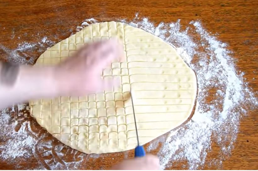 Ρίχνουμε αλεύρι στο τραπέζι μας και ανοίγουμε τη ζύμη με τον πλάστη με πάχος 1 εκ. Χαράζουμε την επιφάνεια του κατά μήκος και κατά πλάτος.