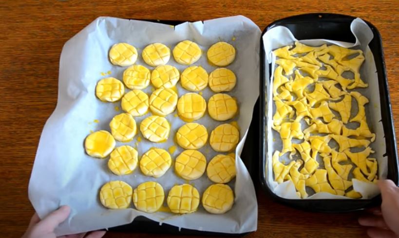 Τα βάζουμε σε ταψί στο οποίο έχουμε στρώσει αντικολλητικό χαρτί τα αλείφουμε με αυγό,