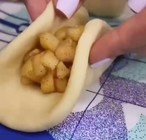 Αφήνουμε να φουσκώσει για 1,5 ώρα, εν τω μεταξύ φτιάχνουμε τη γέμιση. Κόβουμε τα μήλα σε κύβους, τηγανίζουμε σε χαμηλή φωτιά με ζάχαρη και κανέλα ώστε τα μήλα να είναι μαλακά,