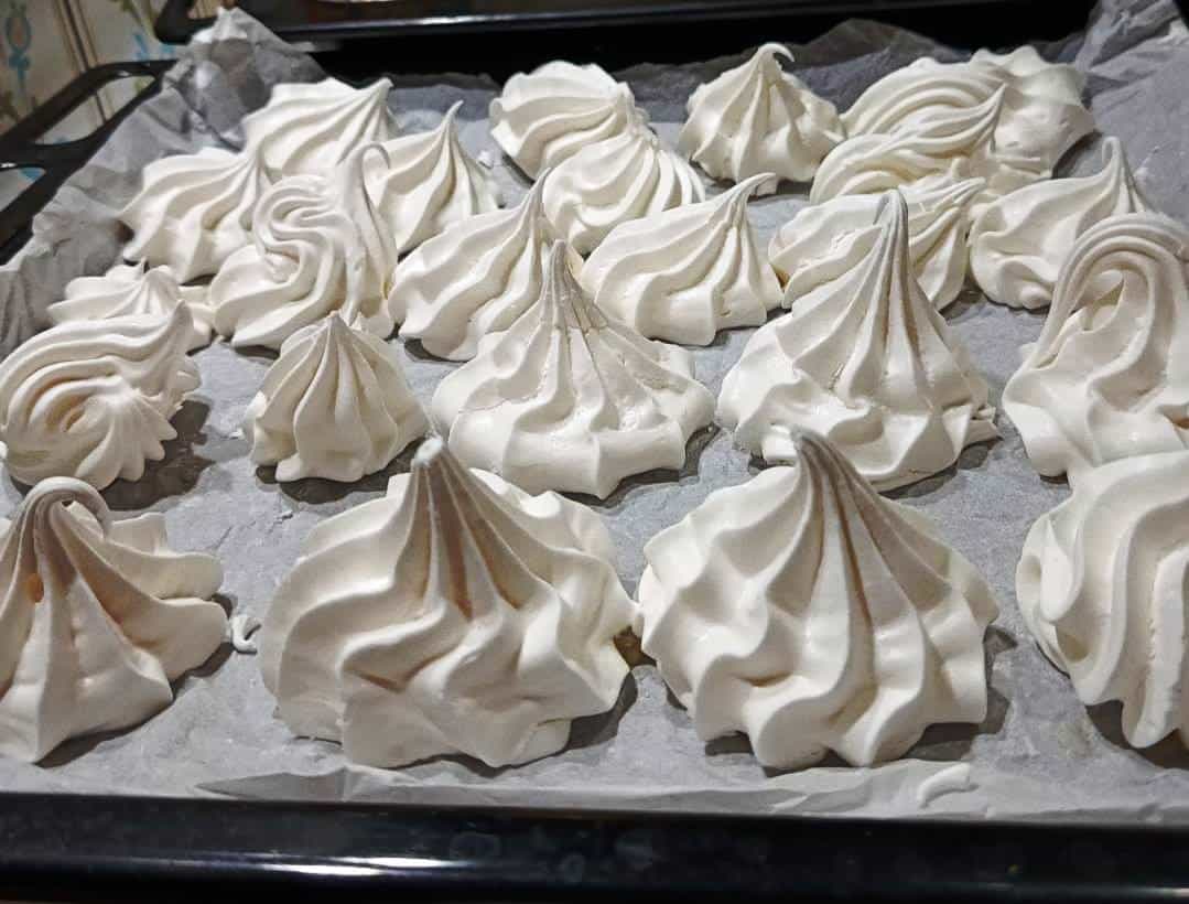 Ψήσιμο (Στέγνωμα): Οι μαρέγκες δεν ψήνονται, αλλά στεγνώνουν σε πολύ χαμηλή θερμοκρασία (90°C αέρας). Όταν τελειώσουν, αφήστε τους μέσα στον κλειστό, σβηστό φούρνο μέχρι να κρυώσουν εντελώς. Έτσι γίνονται απόλυτα τραγανοί και στεγνοί.