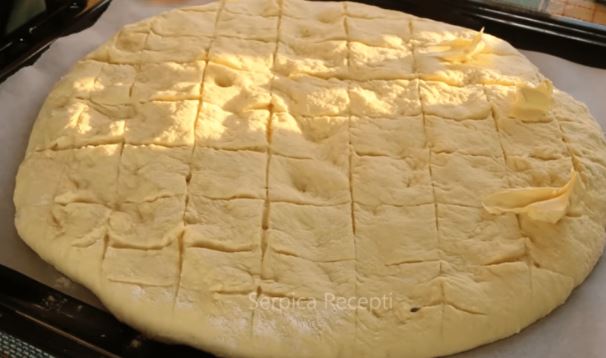 4. Αφήνω τη ζύμη να ξεκουραστεί για περίπου 15 λεπτά. Στη συνέχεια, τη μεταφέρω σε ένα ταψί που έχω λαδώσει ελαφρώς.