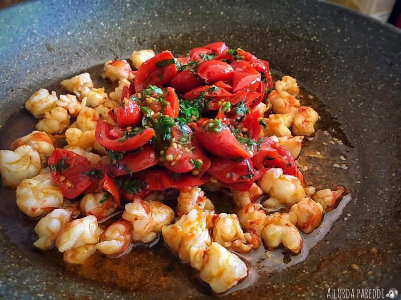 3. Βάζω τις γαρίδες, που έχω καθαρίσει από πριν, και τις μαγειρεύω για λίγα λεπτά, μέχρι να ροδίσουν
