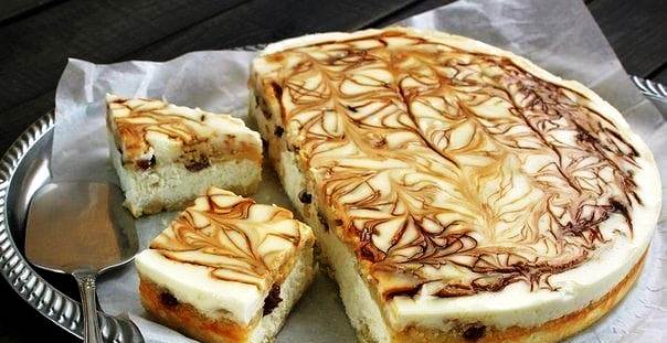 Από πάνω ρίχνουμε τη γέμιση τυριού σε ομοιόμορφη στρώση. Προσθέστε σταφίδες αν θέλετε.