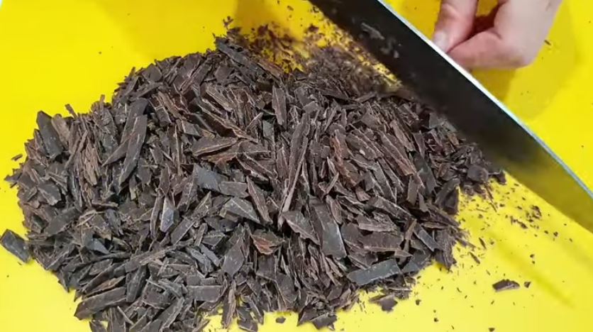 Ψιλοκόβουμε τη σοκολάτα και την βάζουμε σε ένα μεγάλο μπολ.