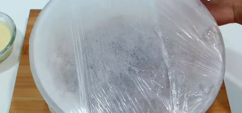 Αφήνουμε να έρθει σε θερμοκρασία δωματίου. Σκεπάζουμε το μπολ με διάφανη μεμβράνη και το βάζουμε στο ψυγείο για 25 λεπτά.