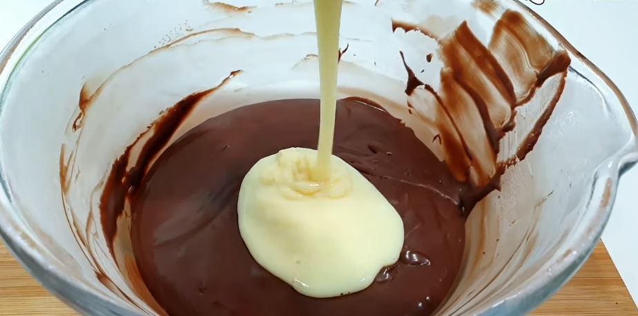 Ρίχνουμε τη ζεστή κρέμα γάλακτος πάνω από τη σοκολάτα και ανακατεύουμε με μία σπάτουλα πολύ καλά μέχρι να λιώσει.