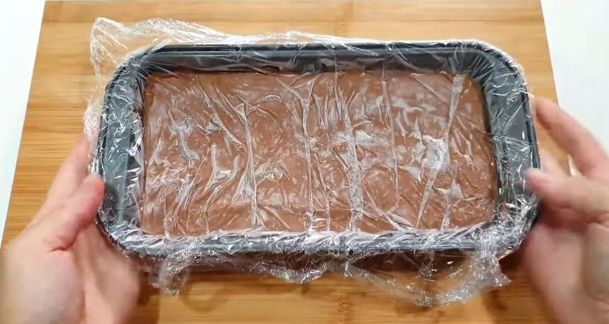 Την βάζουμε σε μία μικρή φόρμα απλώνουμε να πάει παντού και σκεπάζουμε με διάφανη μεμβράνη.