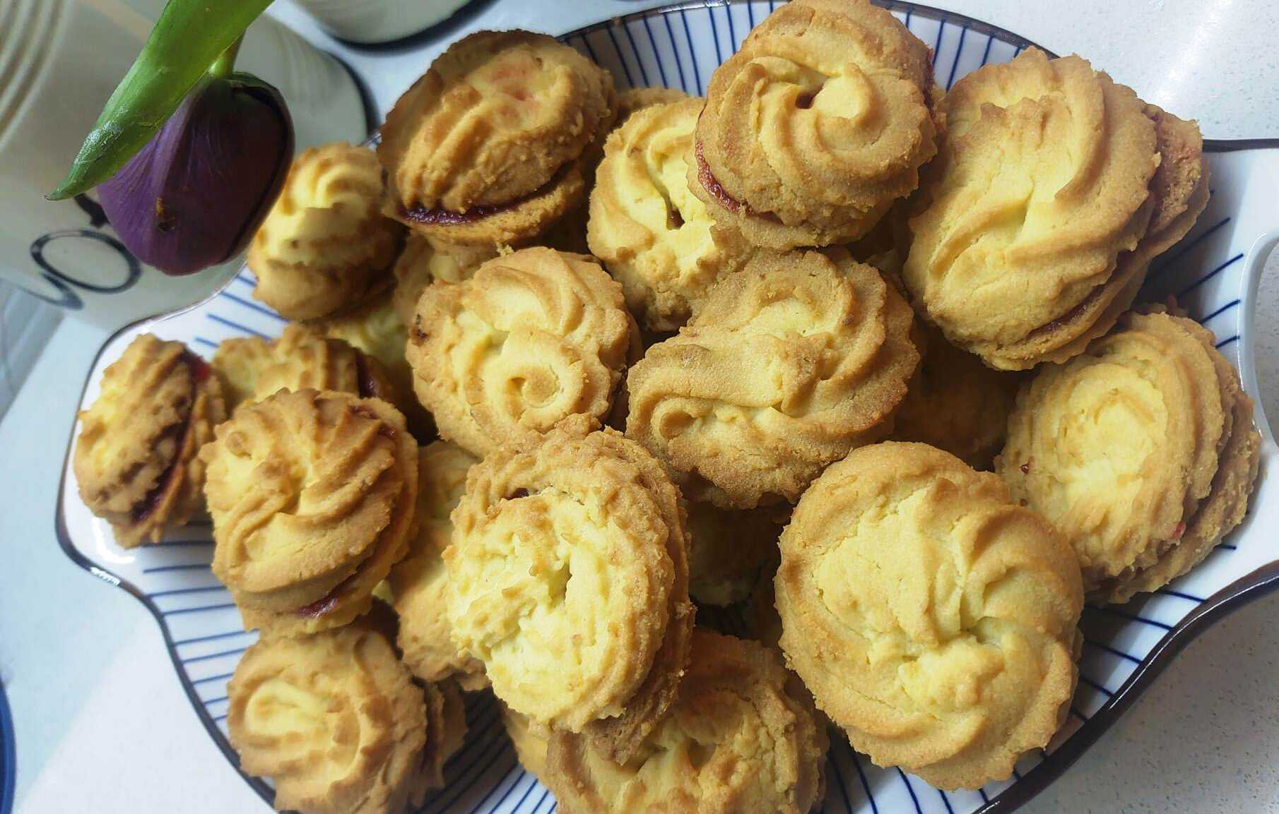 Βάζουμε τη μαρμελάδα σε μια σακούλα ζαχαροπλαστικής και μοιράζουμε στα μισά μπισκότα.