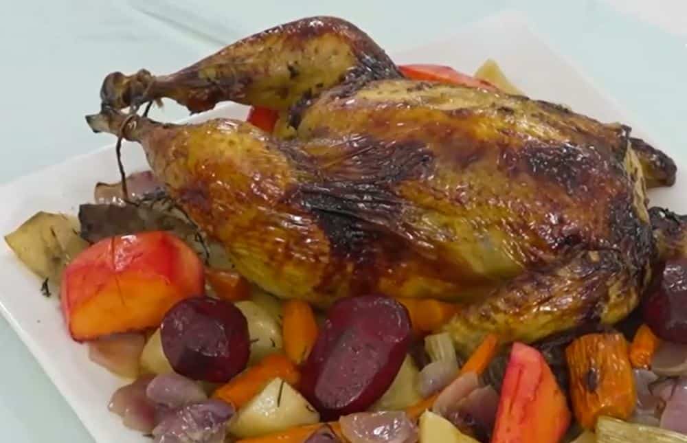 Το κοτόπουλο, μαλακωμένο από το αρωματικό βούτυρο, παντρεύεται υπέροχα με τις γλυκές και γήινες γεύσεις των χειμερινών ριζών.