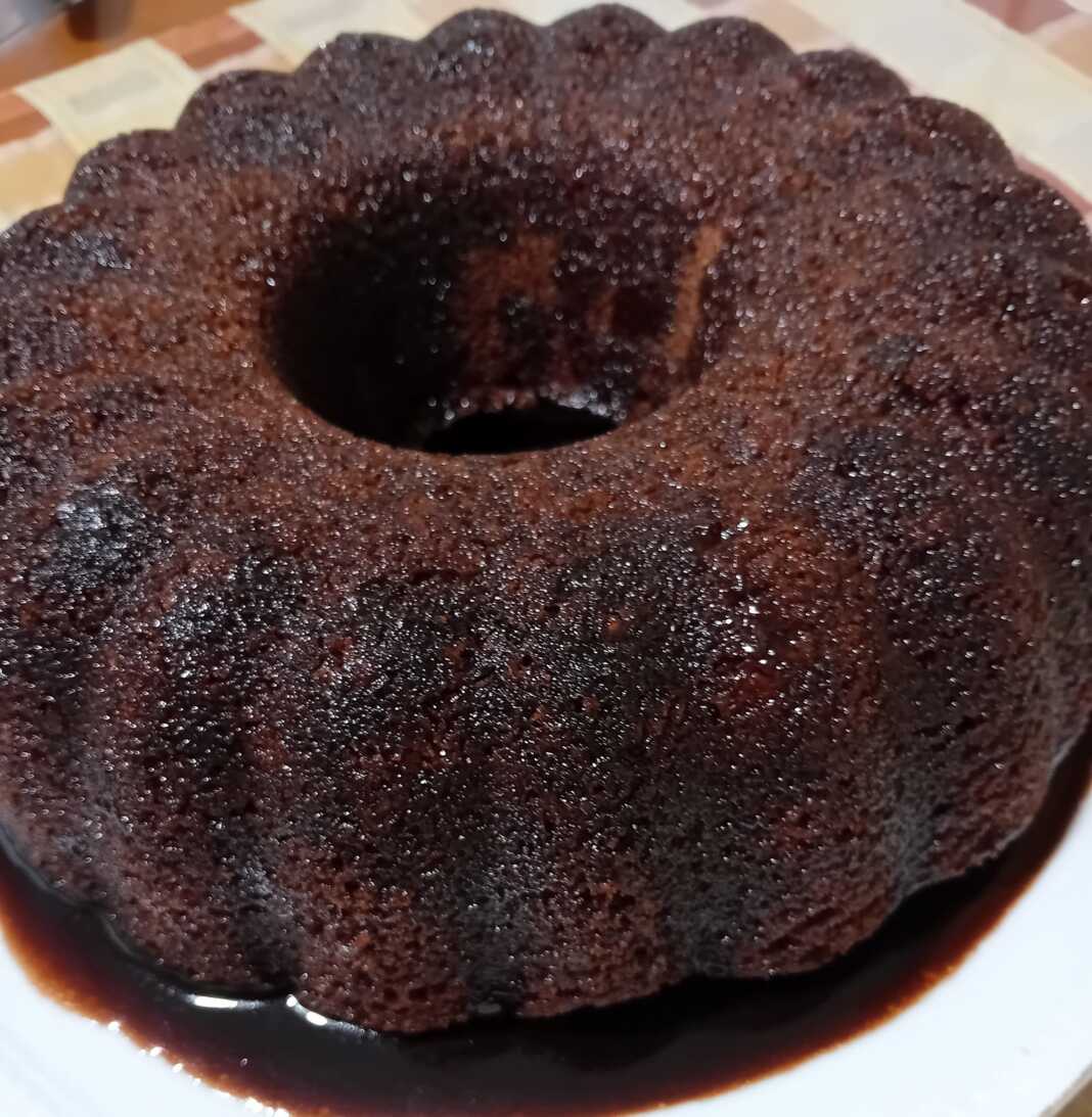 Πρώτο Γλάσο: Μόλις βγάλουμε το κέικ από τον φούρνο, το περιχύνουμε (όπως είναι ακόμα μέσα στη φόρμα) με το γλάσο από την μία κούπα που βάλαμε στη συντήρηση του ψυγείου.