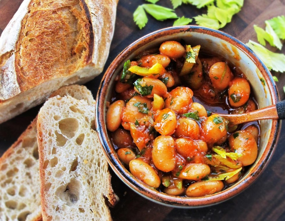 Ανακατεύουμε το μαϊντανό, τον άνηθο, τα φασόλια και το 1/2 φλυτζάνι από το υγρό που τα φασόλια μαγειρεύτηκαν μέσα στη σάλτσα ντομάτας.