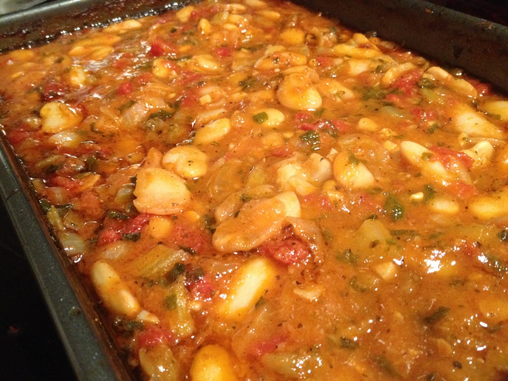Απλώστε τα φασόλια ομοιόμορφα στο ταψί και ρίχνουμε τη σάλτσα πάνω. Προσθέστε 1 φλιτζάνι νερό σε θερμοκρασία δωματίου και ψήστε, ακάλυπτα, για 2 ώρες σε φούρνο 180 βαθμών. Ανακατέψτε περίπου κάθε μισή ώρα περίπου.