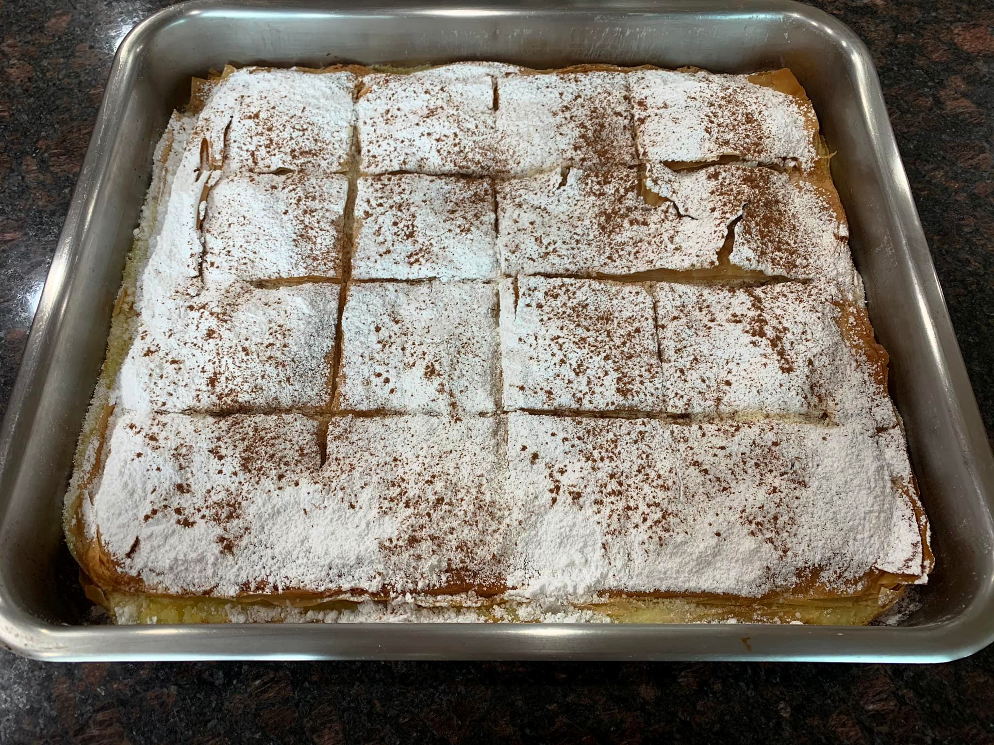 Βουτυρώνω 6 φύλλα, κάτω και βάζω την γέμιση, 6 φύλλα επάνω, καί χαράζω ελαφριά, ψήνουμε στην μεσαία σχαρα του φούρνου, έως ότου χρυσίσει το φύλλο , περίπου 45 λεπτά!!!! Βάζουμε ζάχαρη άχνη και κανέλλα !!!