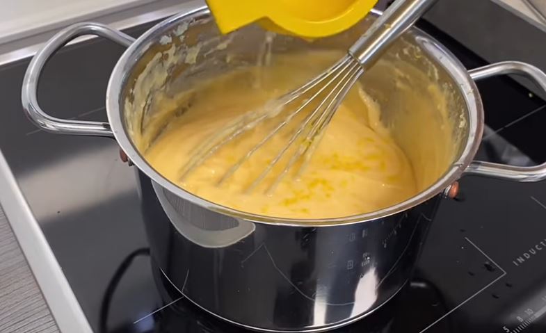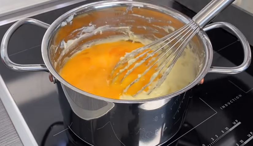 Σε ένα μπολάκι χτυπάω τα αυγά και τα προσθέτω μέσα στην κρέμα και ανακατεύω με το συρμα δυνατά να πάρω μία παχύρευστη κρέμα.