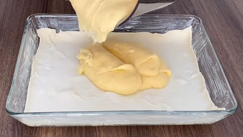 Βουτυρώνω ένα πυρέξ και στις πλευρές. Στρώνω την μια σφολιάτα στην βάση και αδειάζω όλη την κρέμα και την απλώνω.