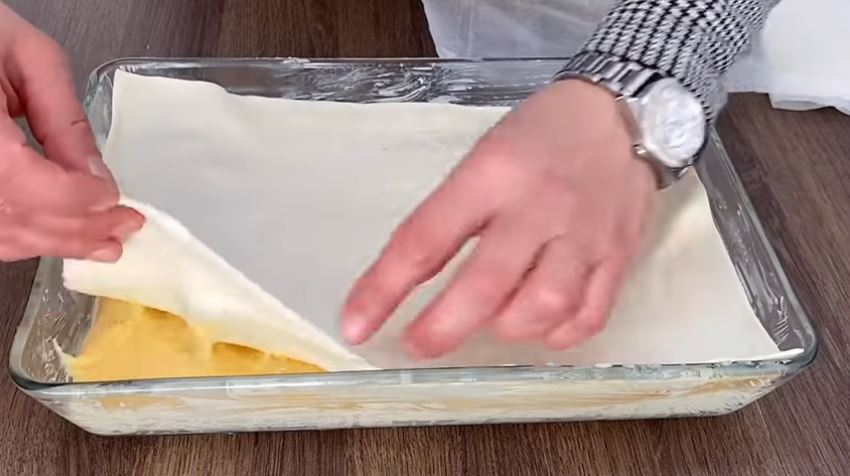 Από πάνω στρώνω το δεύτερο φύλλο και το ταιριάζω να κλείσει γύρω γύρω.