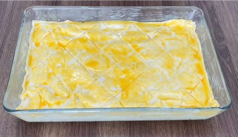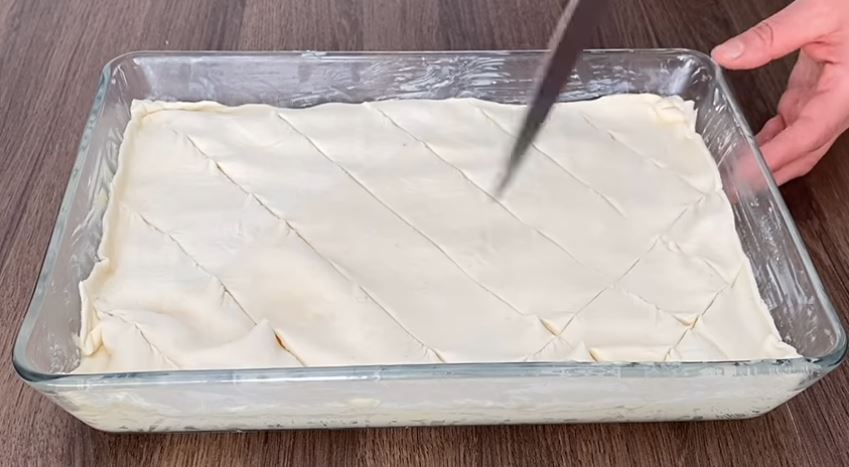Χαράζω μαλακά το πάνω φύλλο μπακλαβοειδώς και αλείφω με κρόκο αυγού