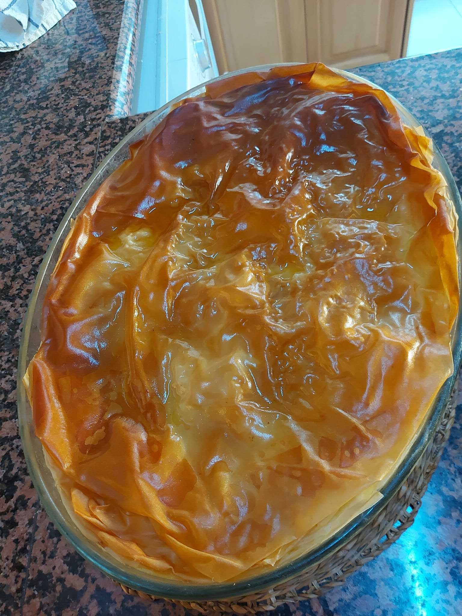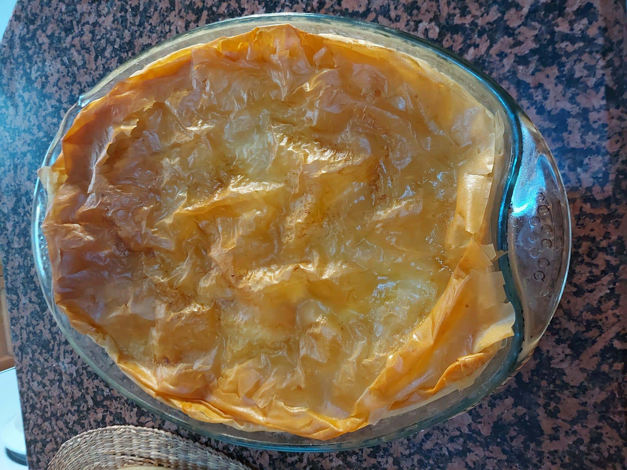 Λιώνω το βούτυρο και απλώνω περίπου τα μισά φύλλα ένα ένα βουτυρωνοντας και ντύνοντας το πυρέξ. Ρίχνω μέσα την κρέμα και μετά σκεπάζω με βουτυρωμενα φύλλα.