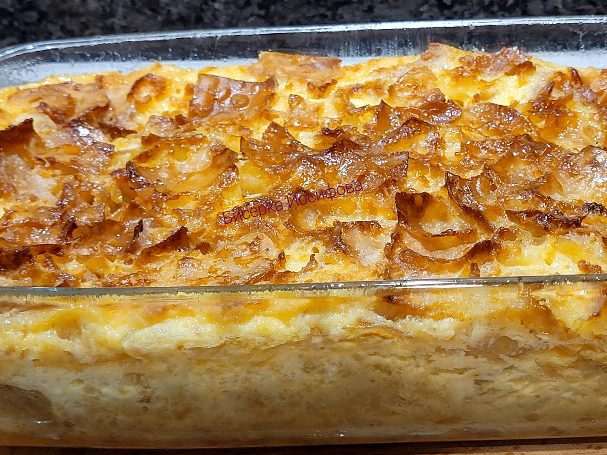 Ετοιμάζουμε το μείγμα από αυγά, γάλα, ζάχαρη, βανίλια και μπέικιν πάουντερ, περιχύνοντας με αυτό το μείγμα τις ψημένες χυλοπίτες.