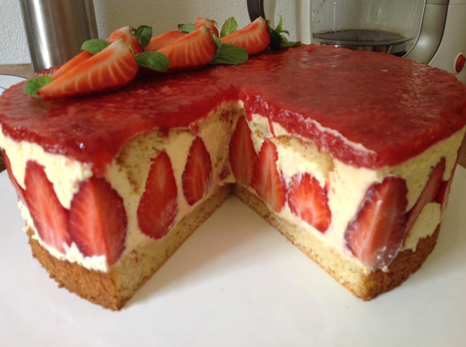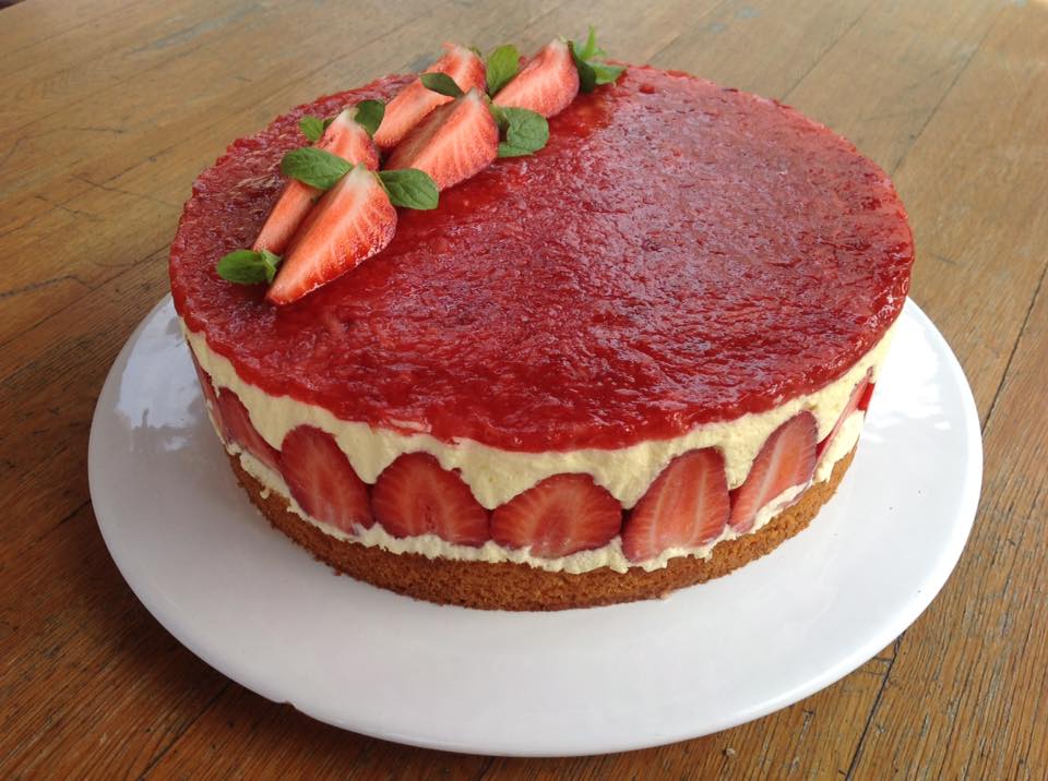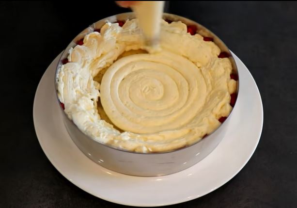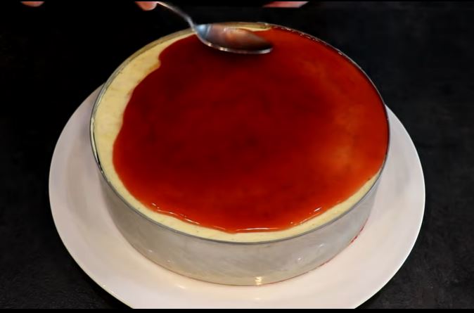 Το ζελέ φράουλας παρασκευάστηκε μετά την συναρμολόγηση του κέικ και την πήξη της στρώσης κρέμας.