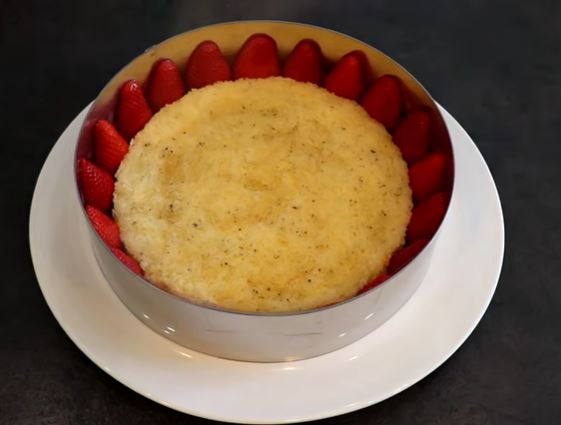 Έστρωσα μια μεμβράνη σε ένα δαχτυλίδι – φόρμα με την οποία έψησα το παντεσπάνι.