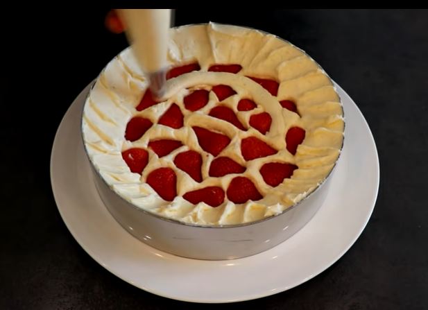 Γεμιζουμε γυρω γυρω και στο κεντρο με κρεμα και σκεπαζουμε να μην φαινονται οι φραουλες.