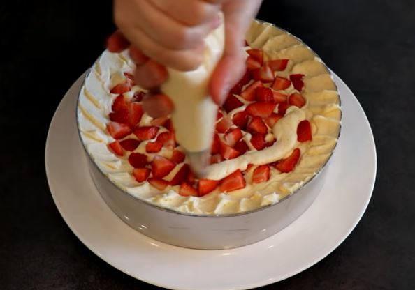 Στο κέντρο της κρέμας ξαναβαζουμε φραουλες και ξανα κρεμα και ξανα φραουλες ψιλοκομμένες και πάλι κρεμα.