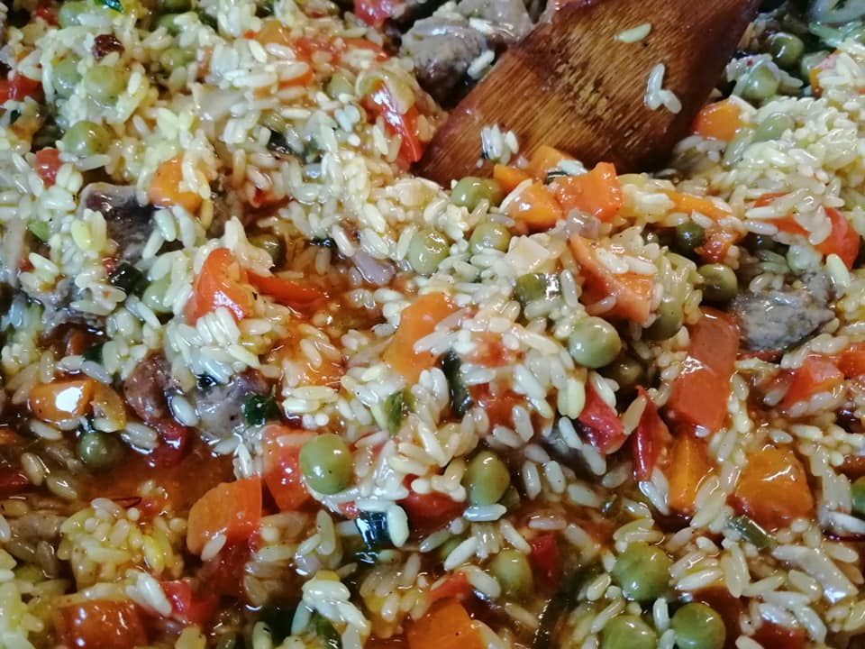 Πριν το σερβίρετε, το πιάτο αφήνεται να ξεκουραστεί για 5-10 λεπτά κάτω από ένα καπάκι ή σκεπασμένο με μια πετσέτα. Επειδη το τηγάνι μ αποδειχθηκε μικρό μετέφερα το ρύζι και τα λαχανικά σε ένα ταψί και έψησα μέχρι να ειναι ετοιμο.
