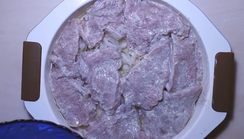 Μαρινάρετε τα φιλέτα τα βάζετε στο ψυγείο για 1-2 ώρες ενώ κόβετε σε φέτες τις πατάτες και κρεμμύδια. Λιπάνετε το ταψάκι σας με βούτυρο, βάζετε πατάτες σε φέτες στο κάτω μέρος, αλάτι και πιπέρι. Απο πάνω τοποθετούμε τα κρεμμύδια και μετά τοποθετήστε το μαριναρισμένο κρέας στην κορυφή.