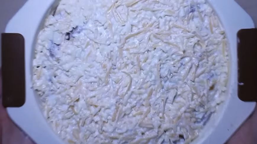 Τρίψτε μέσα σε ένα μπολάκι τυρί (μοτσαρέλα και παρμεζάνα), προσθέστε 2 κουταλιές γιαούρτι και ανακατέψτε.