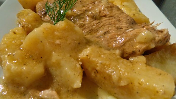 Συγχρόνως περνάμε τις καθαρισμένες και κομμένες κυδωνάτες πατάτες από το τηγάνι να πάρουν χρώμα και τις προσθέτουμε μέσα στο φαγητό αφού προσθέσουμε όπως προανέφερα παρά πάνω λίγο ζεστό νεράκι .
