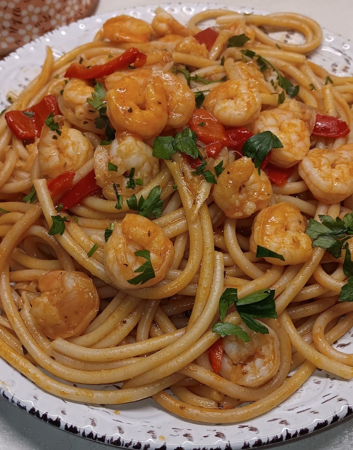όλα μια βράση έριξα 500 ml νερό ζεστό και τα μακαρόνια Ν5 πέντε λεπτά πριν κλείσω την φωτιά έριξα και τς γαρίδες έρχεται