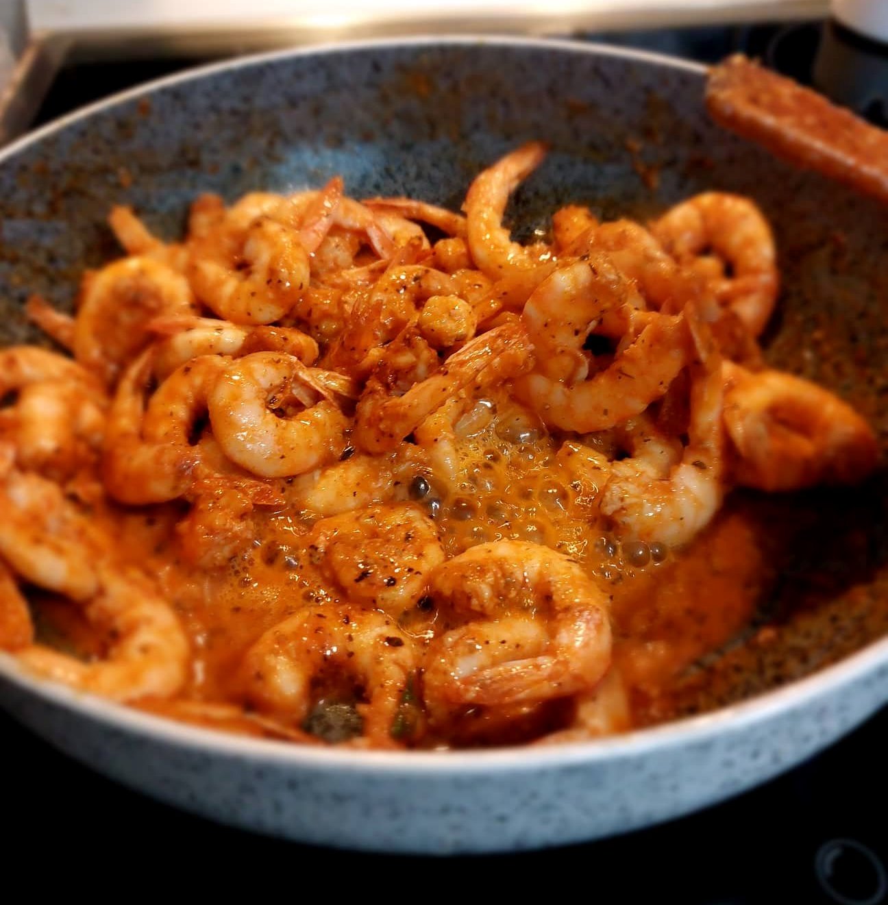Ραντίζουμε γενναιόδωρα με το μείγμα, ζεσταίνουμε το ελαιόλαδο στο τηγάνι και τηγανίζουμε τις γαρίδες μέχρι να είναι έτοιμες, ανακατεύοντας συχνά και προσεκτικά!