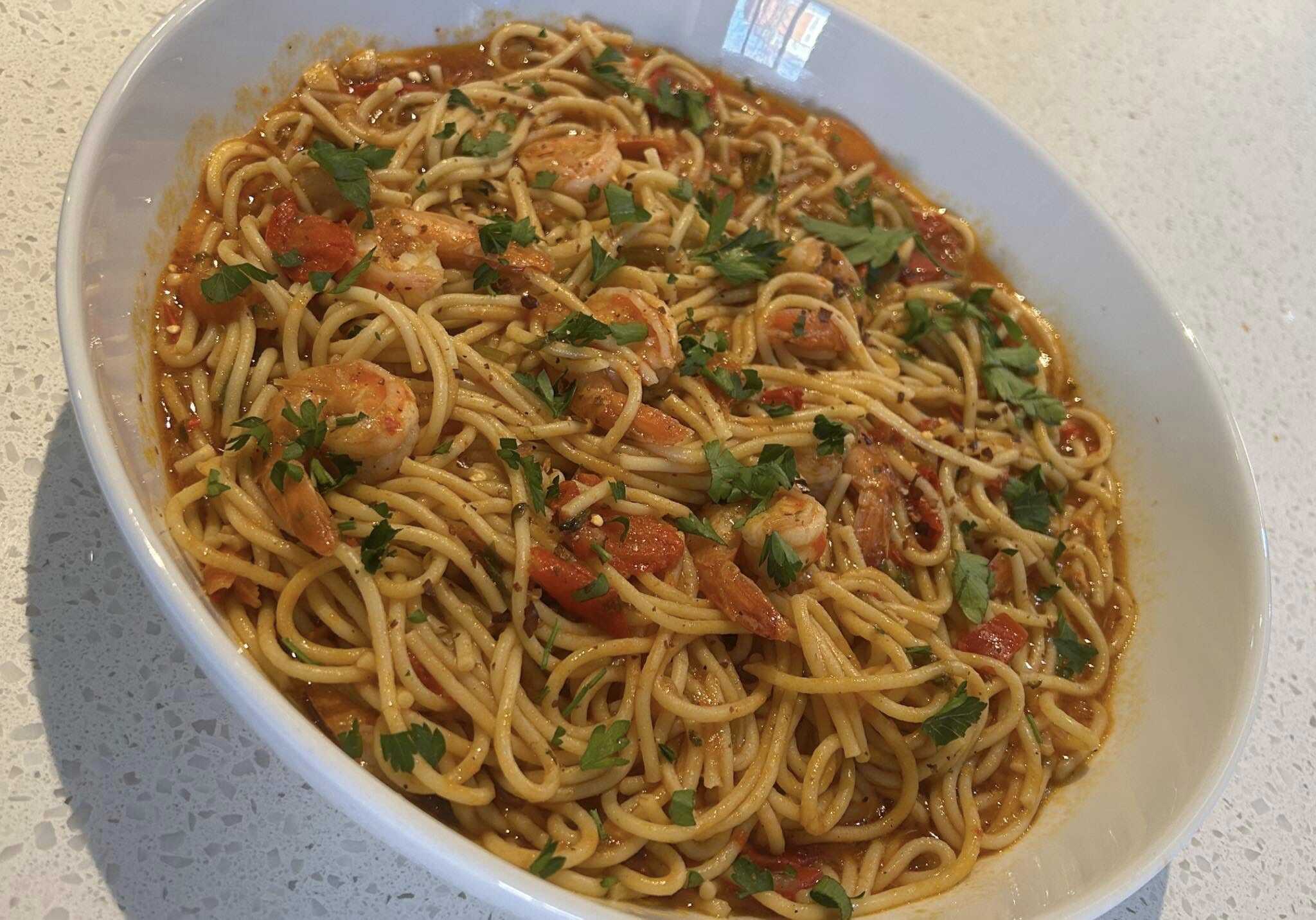 Το σβήνουμε με το κρασί προσθέτουμε το Πελτέ τις ντομάτες το χυμό ντομάτας αλάτι και πιπέρι προσθέτουμε λίγο λίγο και ζωμό από τις γαρίδες. Συνεχίζουμε το βράσιμο για 10 λεπτά προσθέτω κι άλλες δύο κούπες νερό από τις γαρίδες μόλις πάρει βράση βάζω τα μακαρόνια και προς το τέλος προσθέτω τις γαρίδες για άλλα 5 -6 λεπτά. Το φαγητό μας είναι έτοιμο για σερβίρισμα αν θέλουμε προσθέτουμε και ψιλοκομμένο μαϊντανό!!
