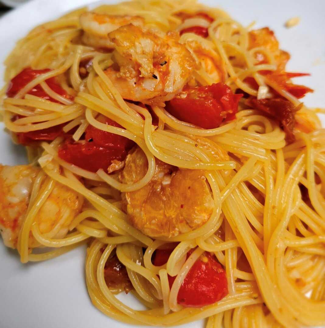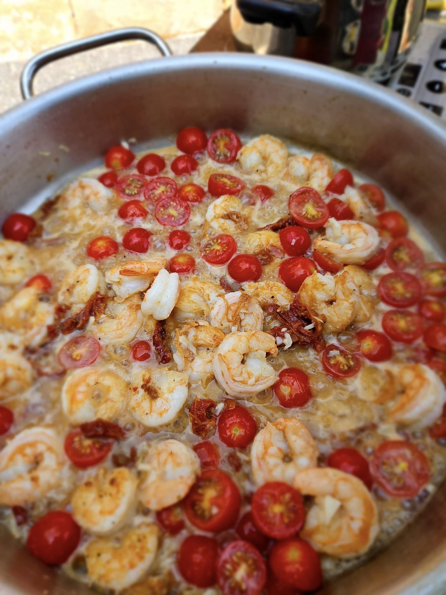 Στράγγιξε τα ζυμαρικά και πρόσθεσέ τα στο τηγάνι με τις γαρίδες και τα ντοματίνια. Ανακάτεψε καλά για να ενωθούν οι γεύσεις.
