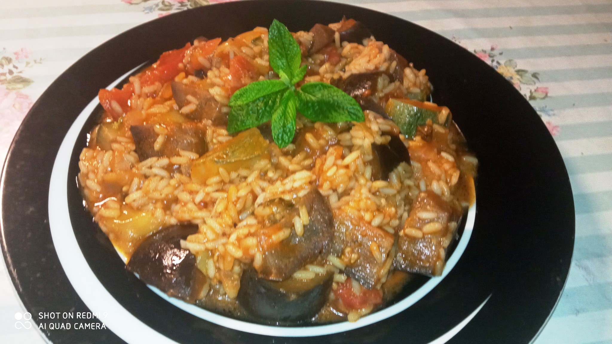 Ρίχνουμε το ρύζι και ανακατεύουμε.