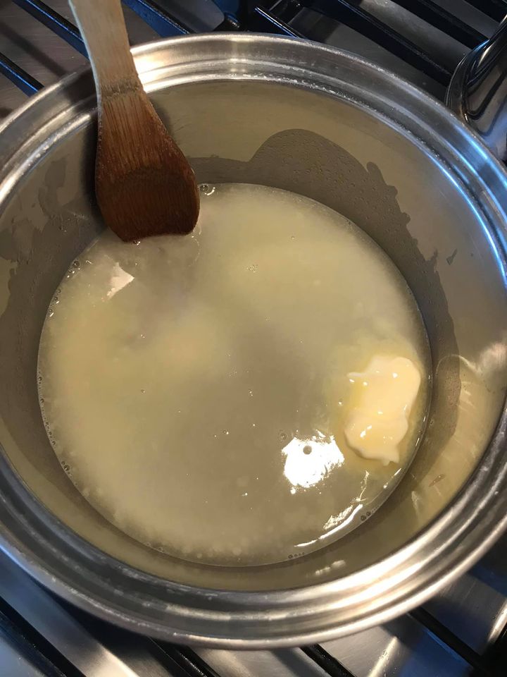 1) Σε μια κατσαρόλα που βάζουμε σε μέτρια υψηλή θερμοκρασία, προσθέτουμε νερό, βούτυρο, ζάχαρη και αλάτι, ανακατεύουμε και αφήνουμε όλα να συνδυαστούν και βράστε,