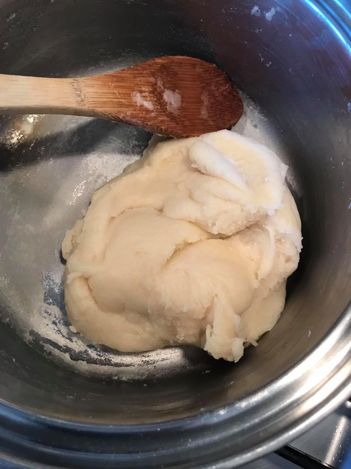 2) Βάλτε το μείγμα σε μια κατσαρόλα σε χαμηλή φωτιά και ανακατέψτε με μια σπάτουλα