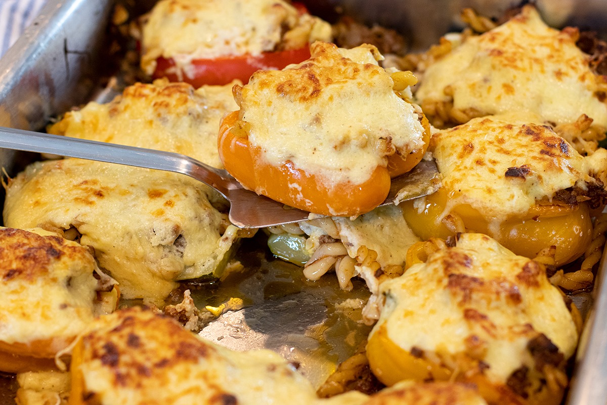 1. Γεμίστε τις πιπεριές με γέμιση κιμά-ζυμαρικών.