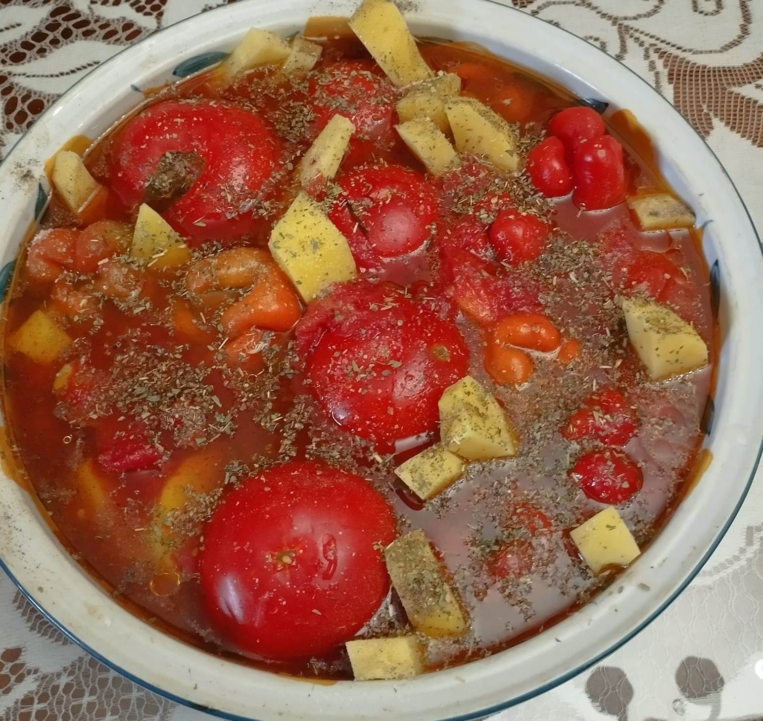 Περιχύνουμε με το ελαιόλαδο, τη σάλτσα ντομάτας, το ζεστό νερό και τη ρίγανη.