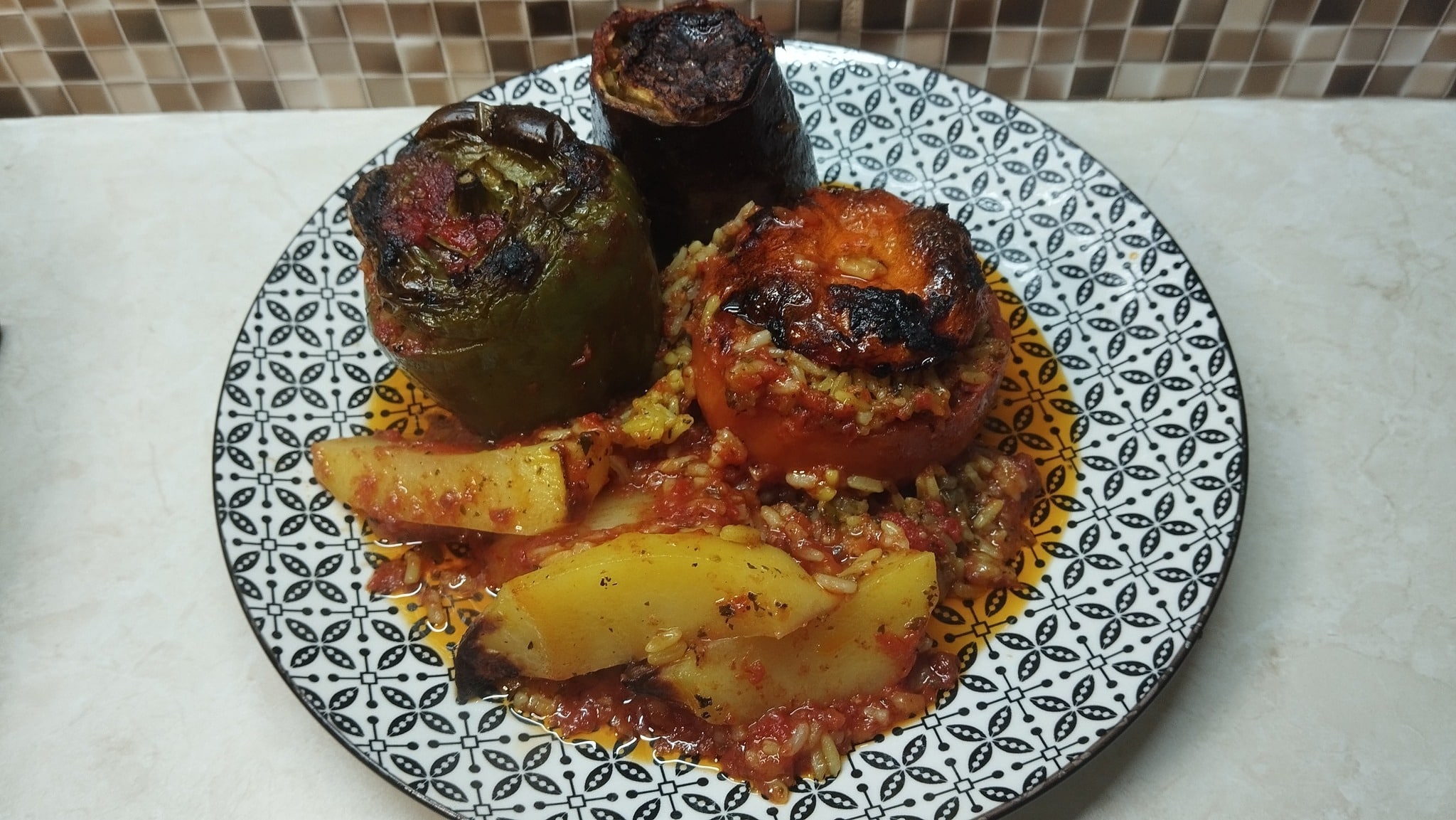 Έχουμε ανοίξει τα γεμιστά φυλάμε την ψύχα από τις ντομάτες, της περνάμε από το multi βάζουμε το κολοκύθι ,τι πιπεριά ,τη μελιτζάνα ,τα αλέθουμε στο multi και αυτά μέσα ,ψιλοκόβουμε το μαϊντανό ρίχνουμε τα υπόλοιπα βασιλικό δυόσμο, το μείγμα λαχανικών, το ρύζι ,λίγο λάδι,το σκόρδο ,τα καραμελωμενα κρεμμύδια,αλάτι και συμπληρώνουμε με λίγο χυμό ντομάτας ανακατεύουμε πολύ καλά και αρχίζουμε και γεμίζουμε τα γεμιστά δύο κουταλιές της σούπας σε κάθε γεμιστό ,στη συνέχεια αφού τελειώσουμε βάζουμε γύρω-γύρω τις πατάτες, αν έχει απομείνει λίγο απ τη γέμιση το βάζουμε μέσα στο ταψί στη συνέχεια τρίβουμε τις ντομάτες περιχύνουμε από πάνω συμπληρώνουμε με χυμό ντομάτας ρίχνουμε λαδάκι μπόλικο αλάτι και φρεσκοτριμμένο πιπέρι τα βάζουμε στο φούρνο για μιάμιση ώρα περίπου σε 180 βαθμούς αέρα ή πάνω-κάτω σερβίρονται ζεστά η παγωμένα