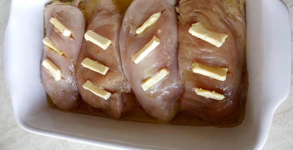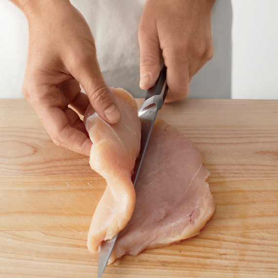 Χωρίστε τα στήθη κοτόπουλου στην μέση και κόψτε τα οριζόντια.
