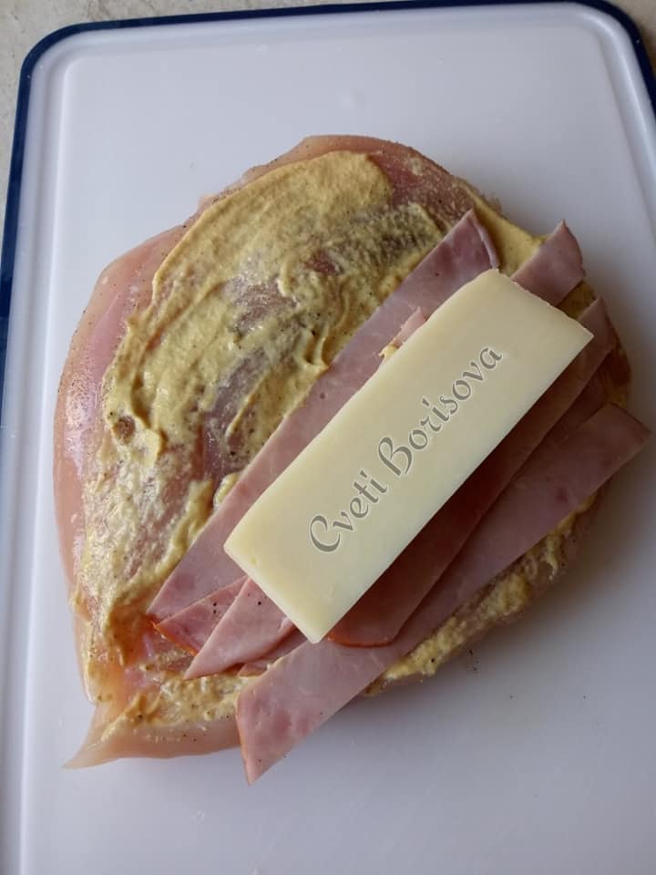 Ανοίξτε τα και απλώστε με μουστάρδα. Τακτοποιήστε κομμάτια ζαμπόν και το κίτρινο τυρί.