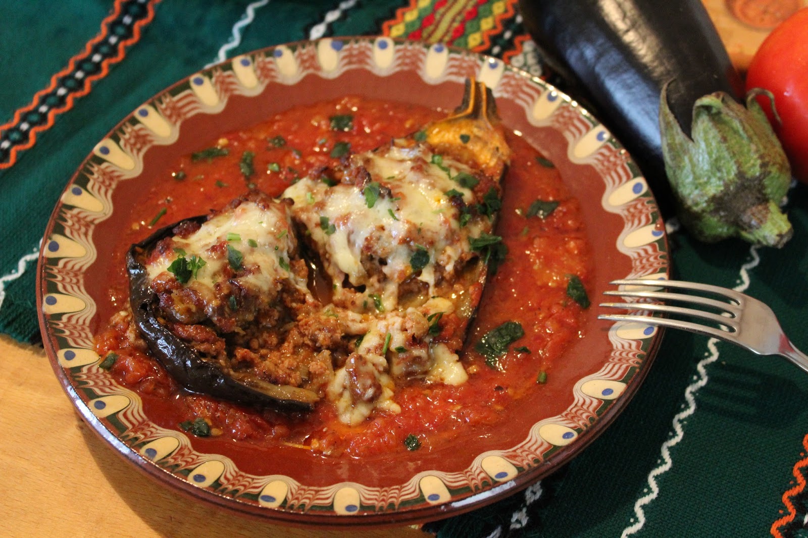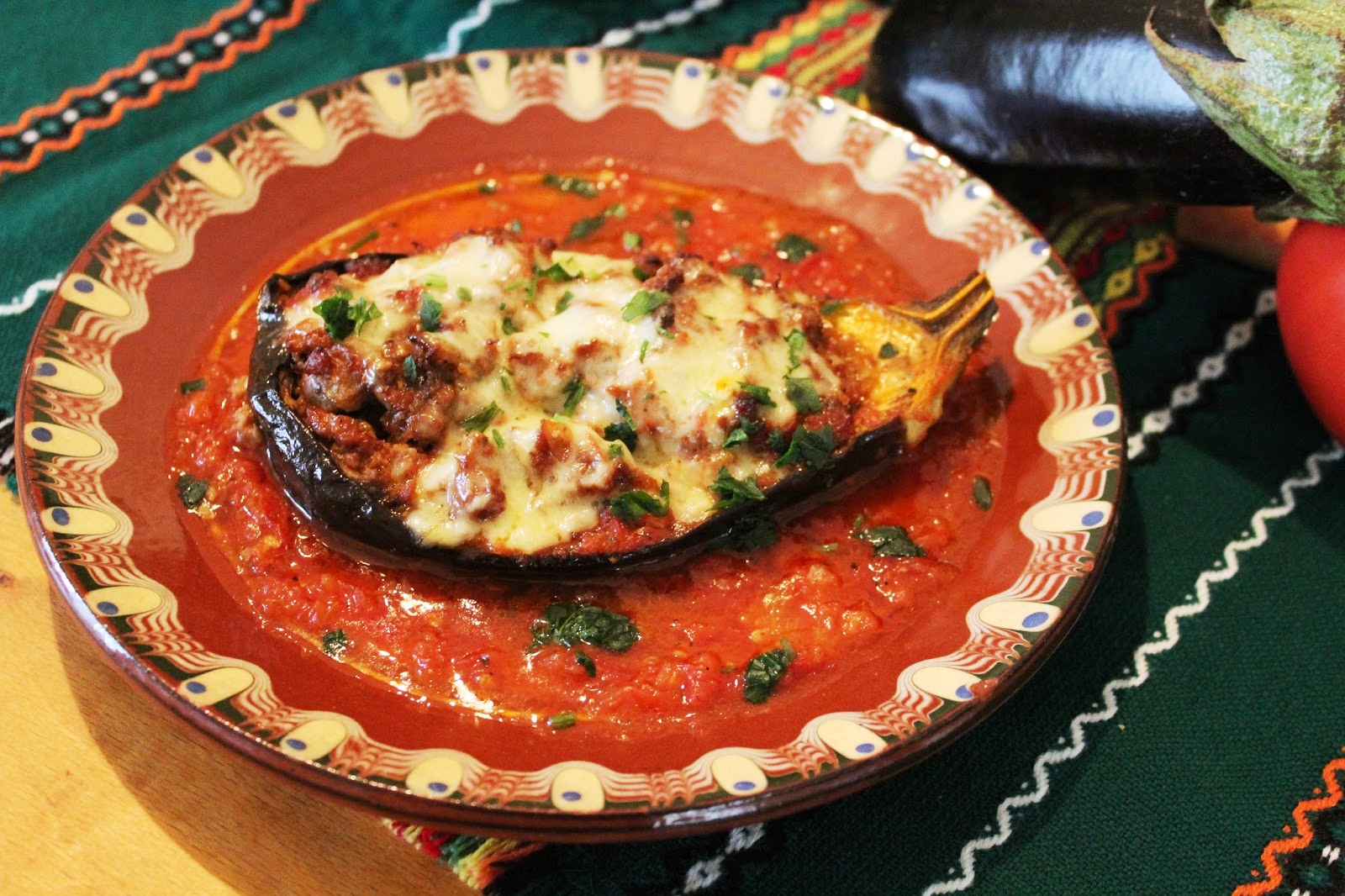 Γεμιστές μελιτζάνες με κιμά, σάλτσα ντομάτα και τυρί