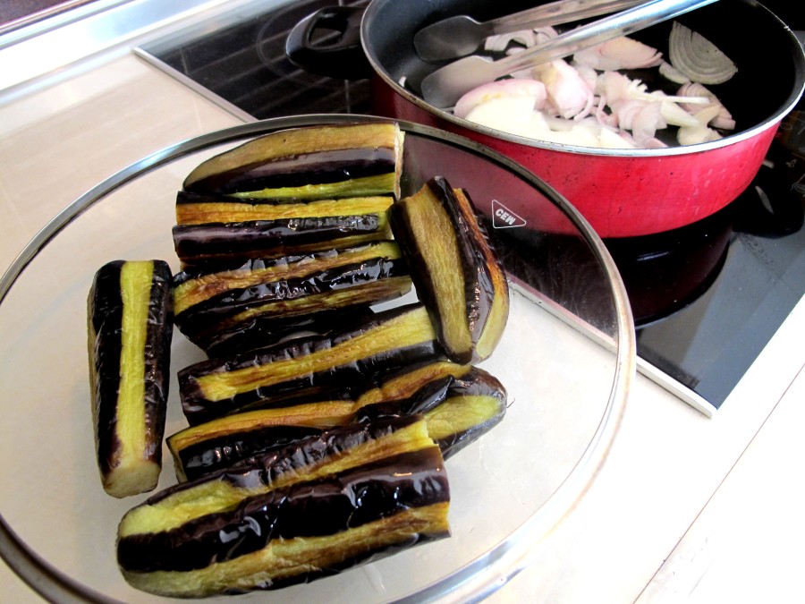 Τηγανίζετε τις μελιτζάνες στο ελαιόλαδο. (Εναλλακτικά μπορείτε να τις ψήσετε, ραντίζοντας με λίγο ελαιόλαδο). Βγάλτε σε απορροφητικό χαρτί κουζίνας και αφήστε στην άκρη.