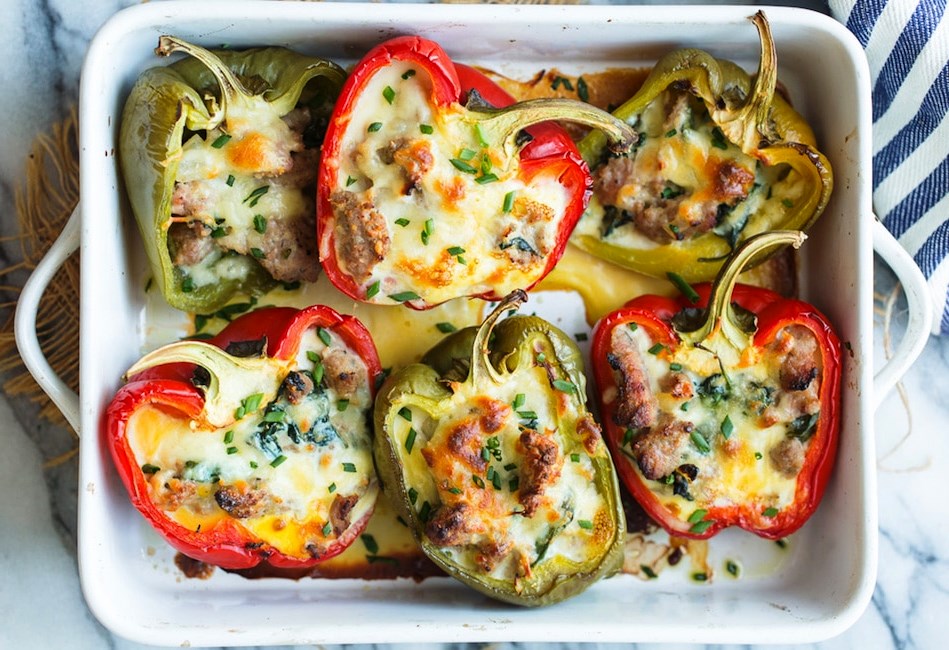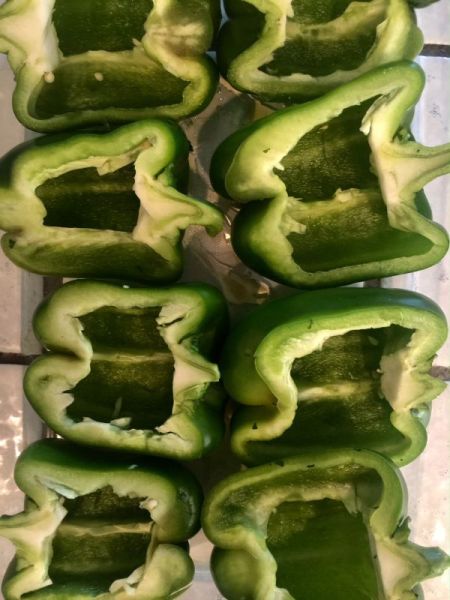 Πλύνετε και κόψτε τις πιπεριές σας στην μέση. Καθαρίστε το εσωτερικό τους, στεγνώστε και τοποθετήστε την πλευρά κοπής προς τα επάνω σε ένα λαδωμένο ταψί.