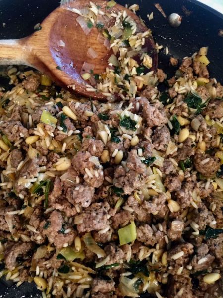 Προσθέστε το ρύζι, το κουκουνάρι και το μαϊντανό και συνεχίστε να μαγειρεύετε για 15 λεπτά σε χαμηλή φωτιά για να μαγειρέψετε το ρύζι. Δοκιμάστε για αλάτι, αν χρειαστεί. Αυτό το βήμα είναι πολύ σημαντικό για να δοκιμάζετε όσο μαγειρεύετε. Ίσως χρειαστεί να προσθέσετε μια κουταλιά της σούπας ή δύο νερό.