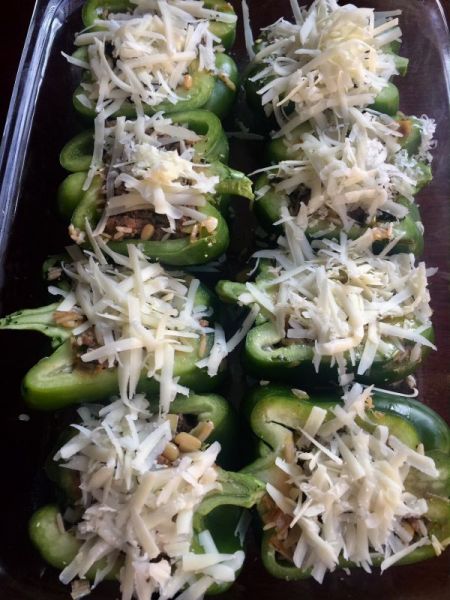 Γεμίστε τις πιπεριές και προσθέστε το τυρί. Ραντίστε τις πιπεριές με ελαιόλαδο.