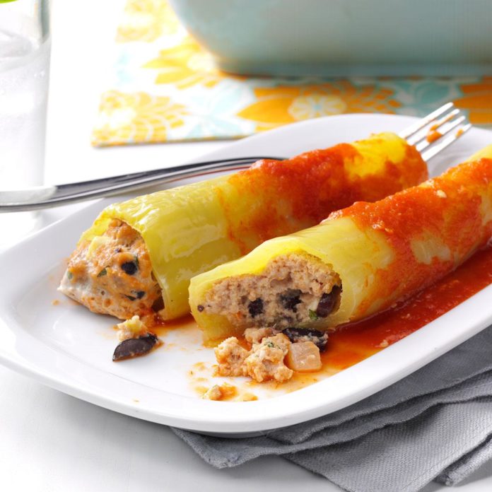 Προθερμάνετε το φούρνο στους 180 °. Κόψτε τις κορυφές από τις πιπεριές μπανάνας, αφαιρέστε τους σπόρους. Σε μία κατσαρόλα, μαγειρέψτε πιπεριές σε βραστό νερό για 2 λεπτά. Αποστραγγίστε και ξεπλύνετε με κρύο νερό και στεγνώστε.