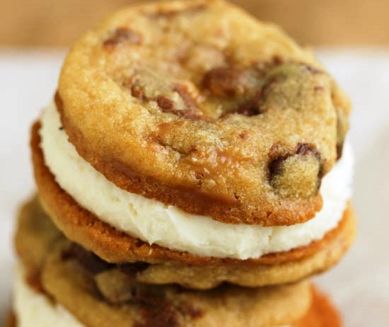 - 2 βανίλιες Στο μίξερ με το “φτερό” χτυπάμε το βούτυρο με τη μαργαρίνη, τις βανίλιες και τη ζάχαρη για 2-3 λεπτά μέχρι να αφρατέψει καλά. Το βάζουμε σε κορνέ και γεμίζουμε τα μπισκότα βάζοντας λίγη στη μέση του μπισκότου και με το άλλο μπισκότο το πιέζουμε ελαφρά να απλωθεί.